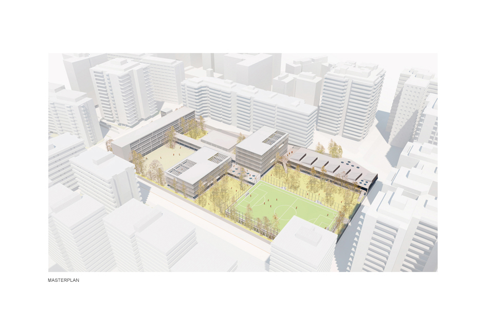 Además de este edificio, en esta fase se reforma parcialmente el aulario existente de primaria, se reordenan (nuevamente) las pistas deportivas y se reforma provisionalmente la plaza del colegio, el corazón espacial del conjunto.